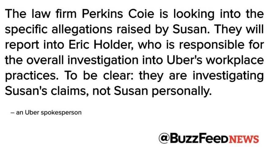Uber names/blames me for account deletes, and has a different law firm -not Holders – investigating me. tweeted by Susan Fowler Rigetti.
