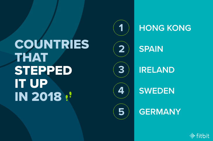 When it comes to stepping, Hong Kong took first place. Leading the charge in the nearly 24 trillion steps users took in 2018, Hong Kong steppers fit in 10,493 daily steps on average over 365 days. Spain came in second with 10,002 average steps. Ireland, Sweden, and Germany rounded out the top five countries who stepped it up in 2018 with 9,726, 9,609, and 9,601 average steps respectively.
