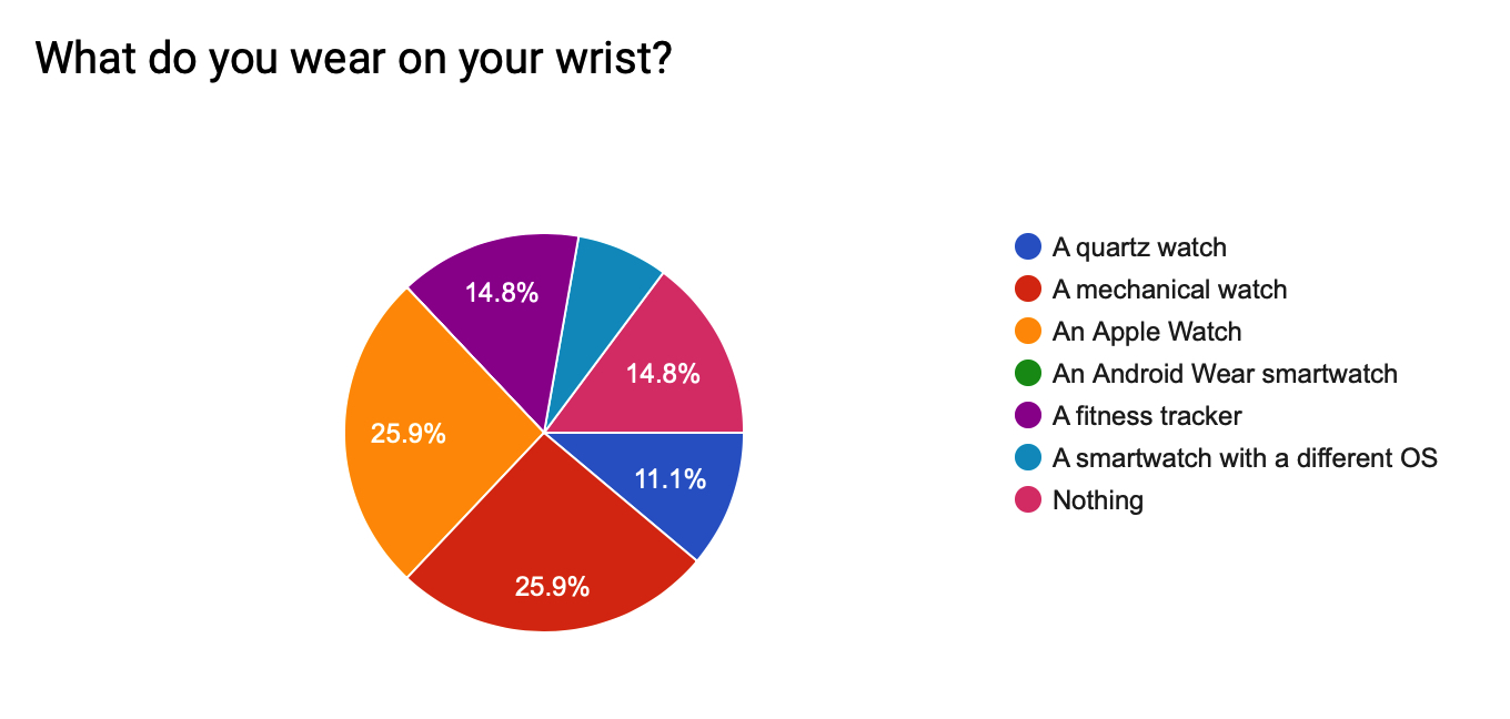 I expected the Apple Watch to be high, but am surprised that mechanical watches get exactly the same number of respondents with quartz lagging somewhat. Not a single Android Wear on the wrist? Really?