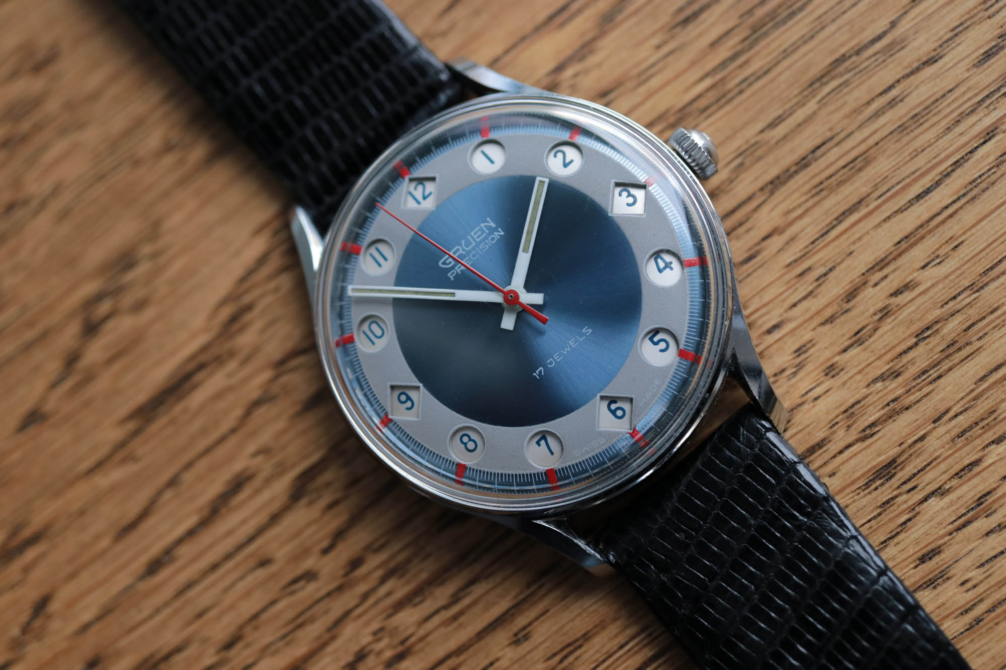 Let’s not beat around the bush: the Gruen Airflight has twelve see-through apertures in the dial. At 1 pm a thin under-the-dial plate shifts automatically to expose the numerals 13 through 24. How cool?! More here. Thanks to Andrew.