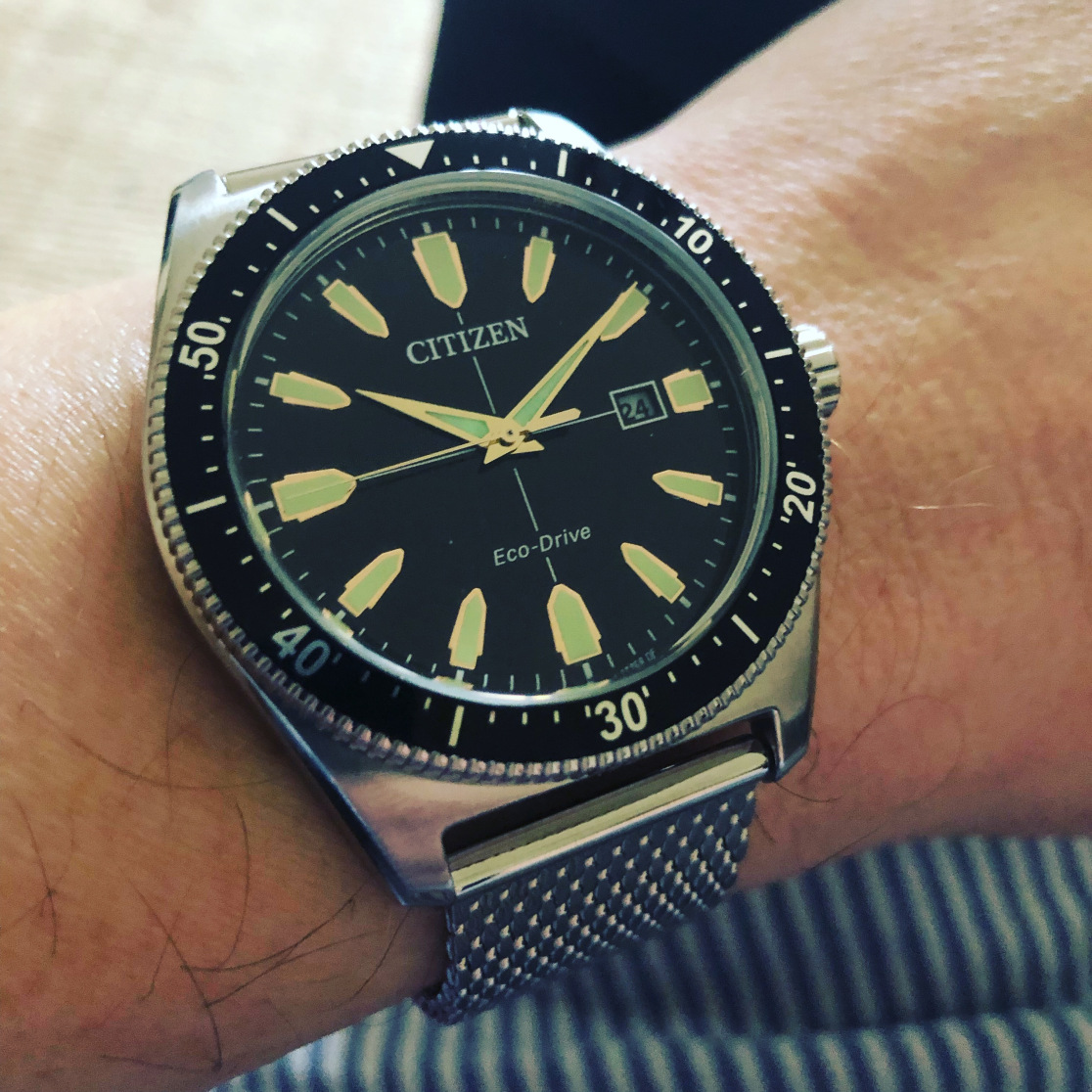 The case shape is not deep at all and curves a little around the wrist when paired with the right bracelet. The included mesh bracelet is of OK quality, but it pulled hairs out of my arm immediately. I do not have particularly hairy arms and this is the first strap to do that so that is a downside. I changed it straight away and this watch pairs very well with almost any 22mm strap thanks to the muted colours. The gold hands and hour markers are extremely subtle and work well with the very very light green inner colouring. Only the hands are lumed, but Citizen has cleverly managed to match the green throughout the dial.