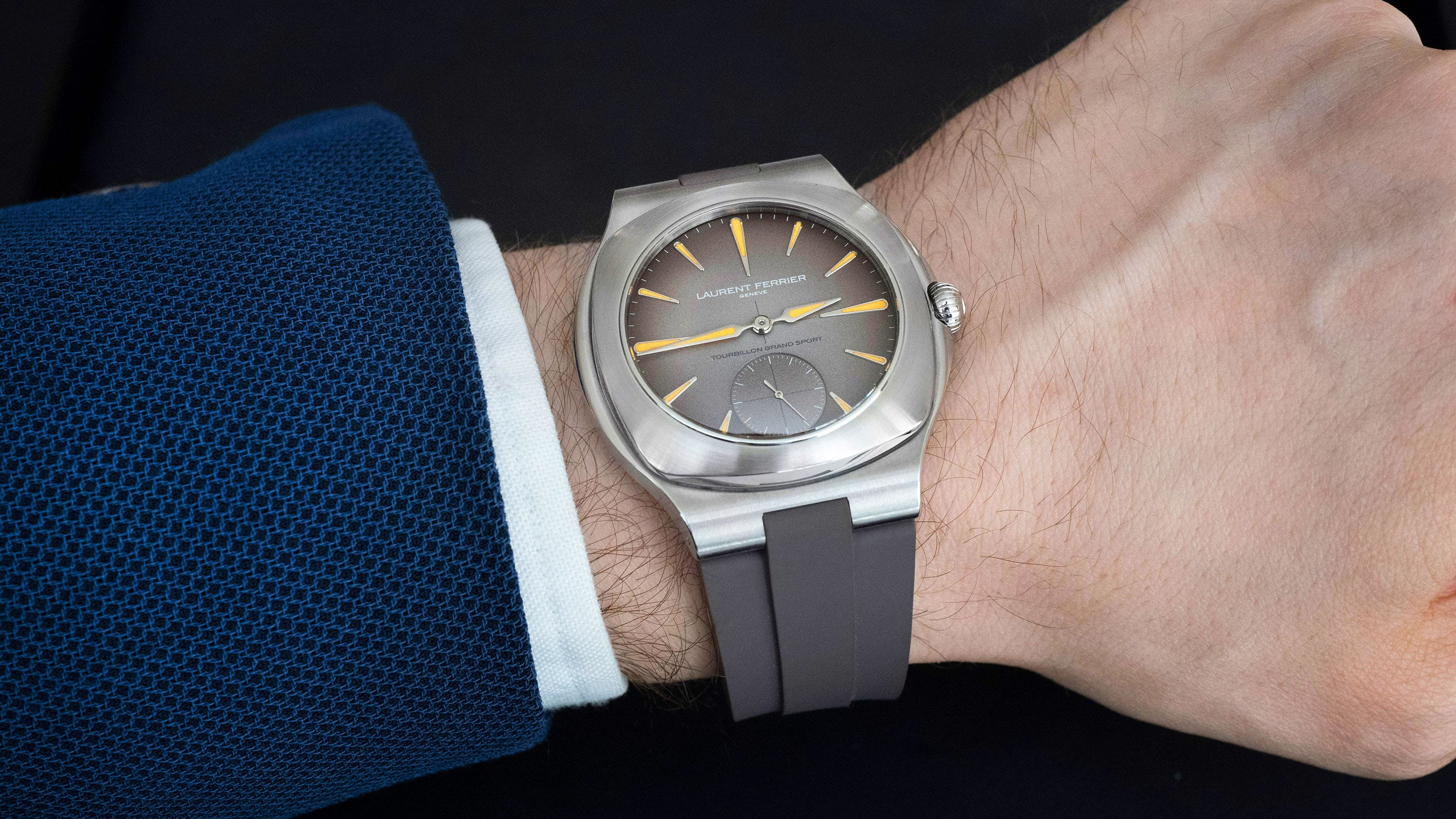 The watch itself is a 44mm stainless steel number with a new case shape that sits somewhere between tonneau and cushion, still with LF’s signature curves and onion crown. In case you weren’t sure about the “sport” in the name, it’s mounted on a rubber strap and it has a dial punctuated by bright flashes of orange Super-LumiNova, so you can read it in any conditions. The dial is a smoked brown color that fades from almost silver at the center, to a dark warm brown at the edges. Turning the watch over, you’ll find a caliber LF 619.01 finished in a striking ruthenium color (similar to a certain other Laurent Ferrier LE…) and with the brand’s double spiral tourbillon mechanism down at the bottom. It’s totally superlative and a nice balance between traditional watchmaking and modern aesthetics… More here.