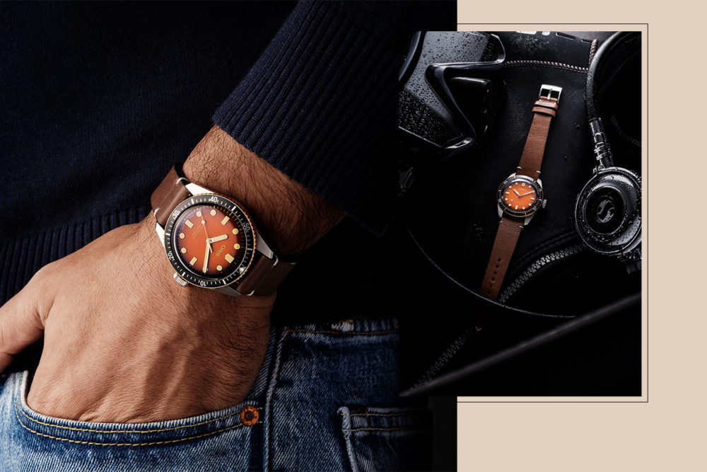 In a watch that we’re retailing for less than $2,000, and depth-rated to 100 metres, you can feel confident submerging into the sea. To keep the dial cleaner we did away with the date function. The resulting watch is profoundly alluring to me, and from across the room people are instantly drawn to its unique multi-hued dial, which pairs perfectly with the slim case and tropical sapphire. It’s a watch that will bring back memories of glorious summers of youth spent basking in the sun, indulging in the pleasure of the season. Oris Divers Sixty-Five ‘Honey’ for The Rake and Revolution Movement Self-winding 4Hz Oris calibre 733, based on Sellita SW200-1; hours, minutes and central hacking seconds; 38-hour power reserve Case 40mm; stainless steel; engraved with Oris X Revolution Limited Edition on the caseback; water resistant to 100m; 250-piece limited edition Strap Brown leather strap, with additional NATO strap and strap-changing tool, included… More here.