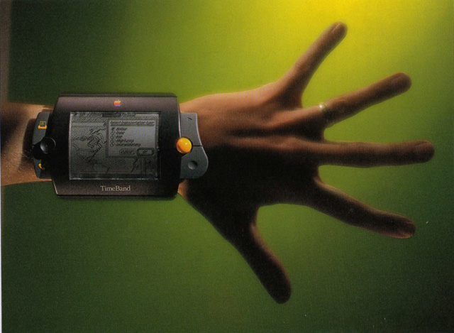 Created as a concept piece by the “Industrial Design Group” who displayed it on the March/April 1991 back cover of Industrial Design magazine, it has buttons on the left that imply phone connectivity and print service. On the screen, menu item Schedule has been selected and the Select Transportation Type dialog box displays Airline, Train, Bus, Ship/Ferry and Interplanetary options to chose from. The TimeBand uses the rainbow Apple logo on the watch but the ad cover itself has the newer pure white logo up in the corner, implying that Apple approved the design and is advertising this advanced industrial design work at Apple… More here.