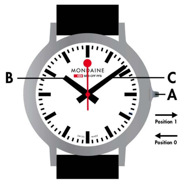 Turn the switch element in the wished direction (clockwise or anti clockwise) and keep it in this position until the hands are showing the correct time.