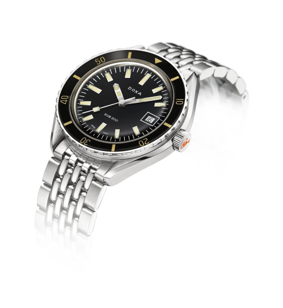 Unveiled at Baselworld 2019, this 3-hand diver’s watch has a case made of highest-quality 316L stainless steel. At a diameter of 42 mm, the SUB 200 is topped by a scratch-resistant sapphire crystal with an anti-reflective coating and the distinctive curvature of the domed plexiglass used back in the day. Waterproof to a depth of 200 meters (20 ATM), the model features a unidirectional rotating bezel. All the elements providing dive-relevant information, including the bezel, have a Super‑LumiNova® luminescent coating. The bracelet is 316L stainless steel and features a folding clasp with the DOXA fish symbol… More here.