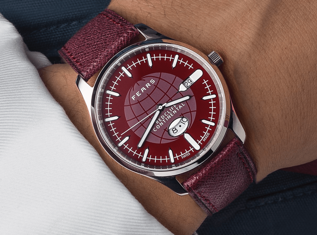 The Redcliff Continental’s dial features a stylised globe emblem picked out in a matte finish against the dial’s gloss base.