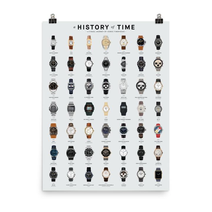 Our 18” x 24” print showcases 49 watches that each hold a place in history, as well as some iconic people who wore them. Museum-quality posters made on thick and durable matte paper… More here.