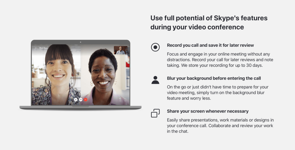 Generate your free unique link with one click, share it with participants and enjoy unlimited meetings with Skype. Full set of features at your disposal. Your meeting link does not expire and can be used anytime… More here.