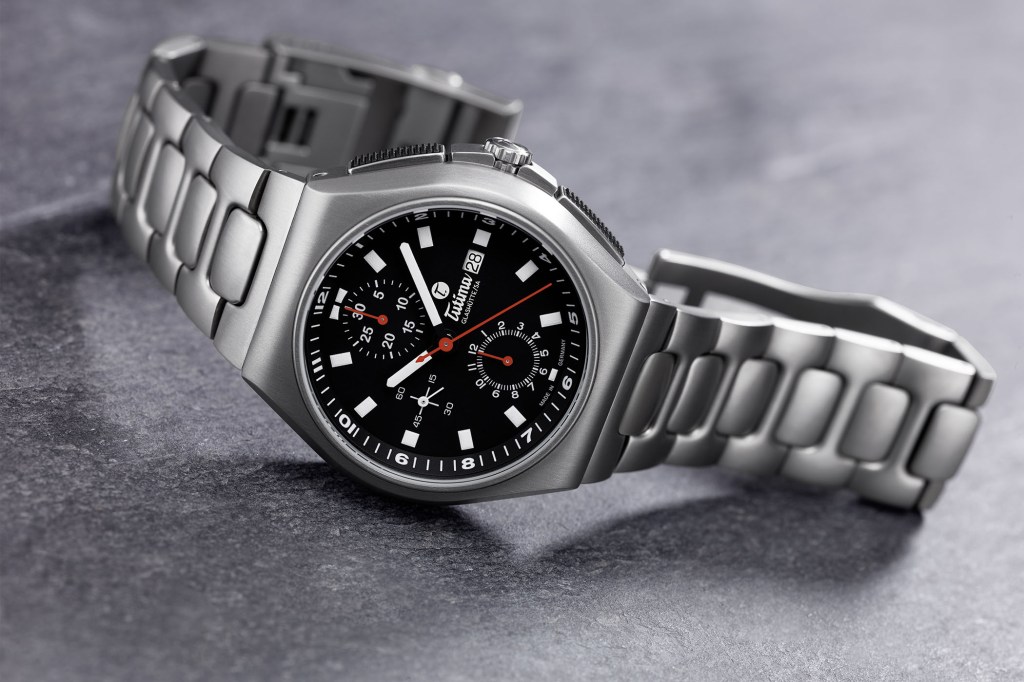 The deep-set dial features a sloping chapter ring for the minutes/seconds with clear white markings and Arabic numerals. The thick rectangular hour markers printed on the dial are shortened at 12 o’clock to accommodate the 30-minute elapsed time counter, at 9 o’clock to house the running seconds and at 6 o’clock for the 12-hour elapsed counter. There is also a date window at 3 o’clock. The linear arrangement of the chronograph functions is easy to consult and Super-LumiNova illuminates the hour and minute hands as well as the indices. The chronograph model with a black dial has red hands for the chronograph indications… More here.