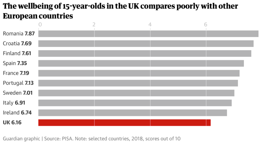 More than a third of UK 15-year-olds scored low on life satisfaction, the annual Good Childhood Report from the Children’s Society found. They also fared badly across happiness measurements including satisfaction with schools, friends and sense of purpose compared to children in other European countries.