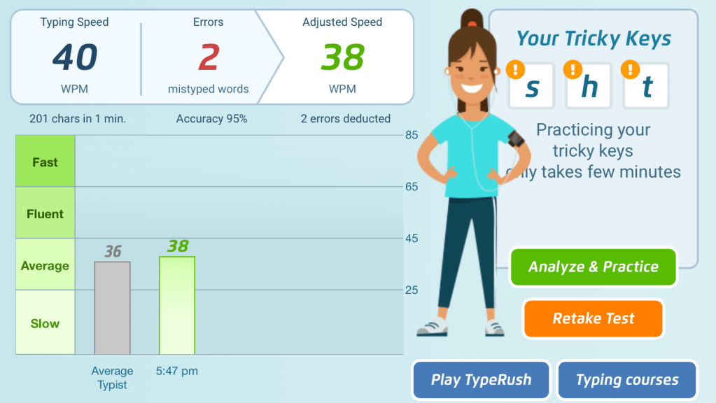 Fun :). I got 92 wpm, but I do spend most of my time typing. Probably could be quicker, except that I’m using a cheap keyboard at the moment.