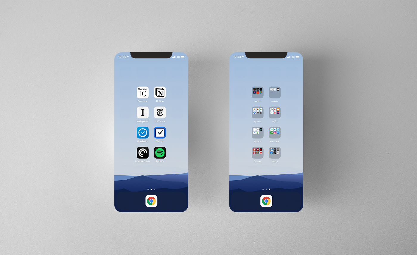 I think giving up half my first homepage real estate to widgets – the default calendar and then widgetsmith’s “fuzzy time” which REALLY resonates for me – achieved some similar things in terms of thinking more carefully about what launchers I really want to have handy
