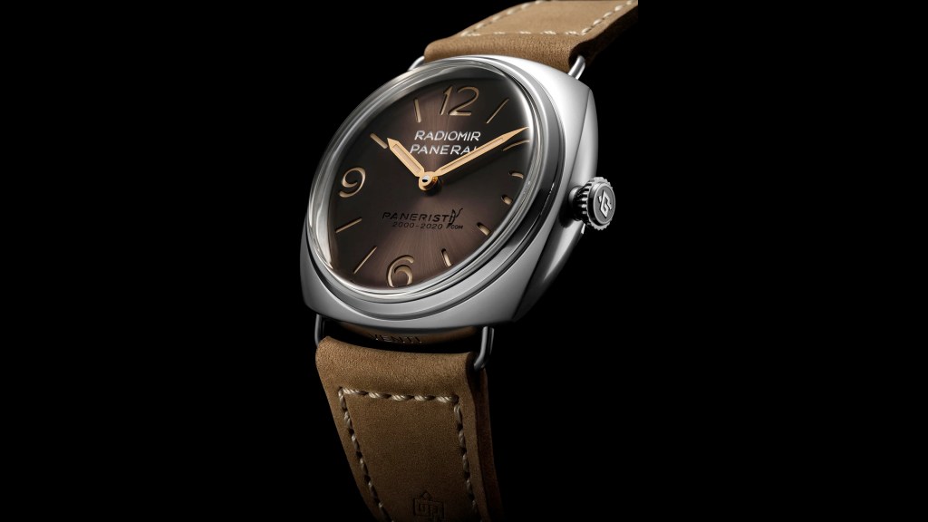 The watch not only pays homage to the 1930s, but also specifically the first Radiomir ever produced. The Radiomir Venti sports sword-shaped gold-color hands (a call back to early models), beige-colored Super-LumiNova, and a brown matte dial. The matte dial is finished in a way to simulate, as the brand puts it, “the effects of time on vintage models that have survived to this day.” Furthermore, Panerai included a “VENTI” engraving between the lugs at 6 o’clock as an additional tribute to the Paneristi.com community on its 20th anniversary… More here.