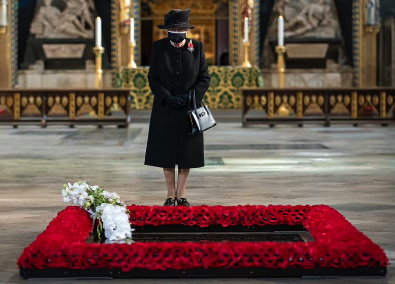 There is so much to consider in this image. The poppies to signify the remembering of our fallen heroes, our head of state masked to signify the tragedy for many that is 2020 and the fact that she stands alone in a time when many are feeling such a huge sense of loneliness. Our head of state has led us through so many troubling times and this image captures so much of that in a peaceful way that stood out to me the moment I saw it. source.