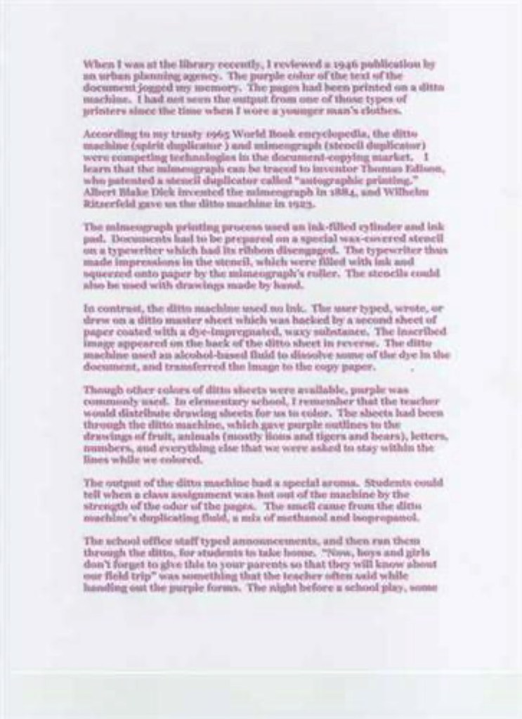 When I was at the library recently, I reviewed a 1946 publication by an urban planning agency. The purple color of the text of the document jogged my memory. The pages had been printed on a ditto machine. I had not seen the output from one of those types of printers since the day when I wore a younger man’s clothes… More here. Thanks to Kirk.