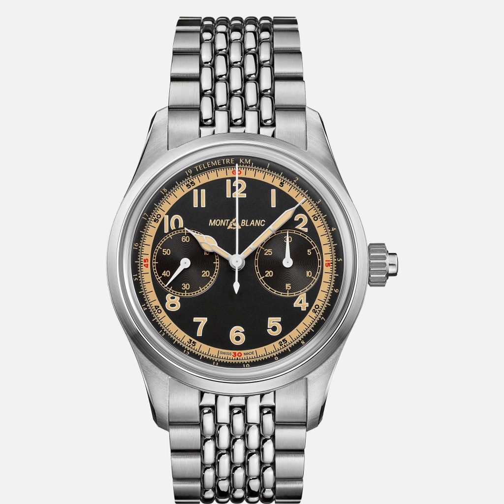 The Montblanc 1858 product line is inspired by the legendary professional Minerva watches from the 1920s and 1930s which were conceived for military use and exploration. Reinterpreting these legendary timepieces, the Montblanc 1858 product line expresses the spirit of mountain exploration, embodying the modern trend of returning to nature. The Montblanc 1858 Monopusher Chronograph comes in a 42 mm full satin-finished stainless steel case with a special engraving on the case back. It features a black and beige two-tone dial that is reminiscent of vintage timepieces and depicts the colours of nature. The chronograph features a telemeter scale and is powered by Montblanc’s automatic MB. 25.12 Monopusher Chronograph Calibre that indicates elapsed time with a central seconds hand and a 30-minute counter, both with white hands to create a contrast with the black dial. The timepiece is completed with a vintage technical bracelet made of stainless steel… More here.
