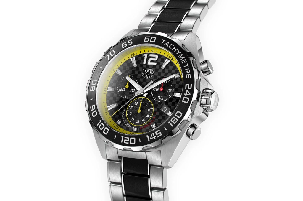 All that is carried over into the new TAG Heuer Formula 1 Special Edition, which has a 43mm stainless-steel case, a carbon-fibre-effect dial, a five-row steel and black ceramic bracelet and a black ceramic bezel engraved with a tachymeter scale (a function for calculating speed over a known distance that, for most wearers, is largely decorative).