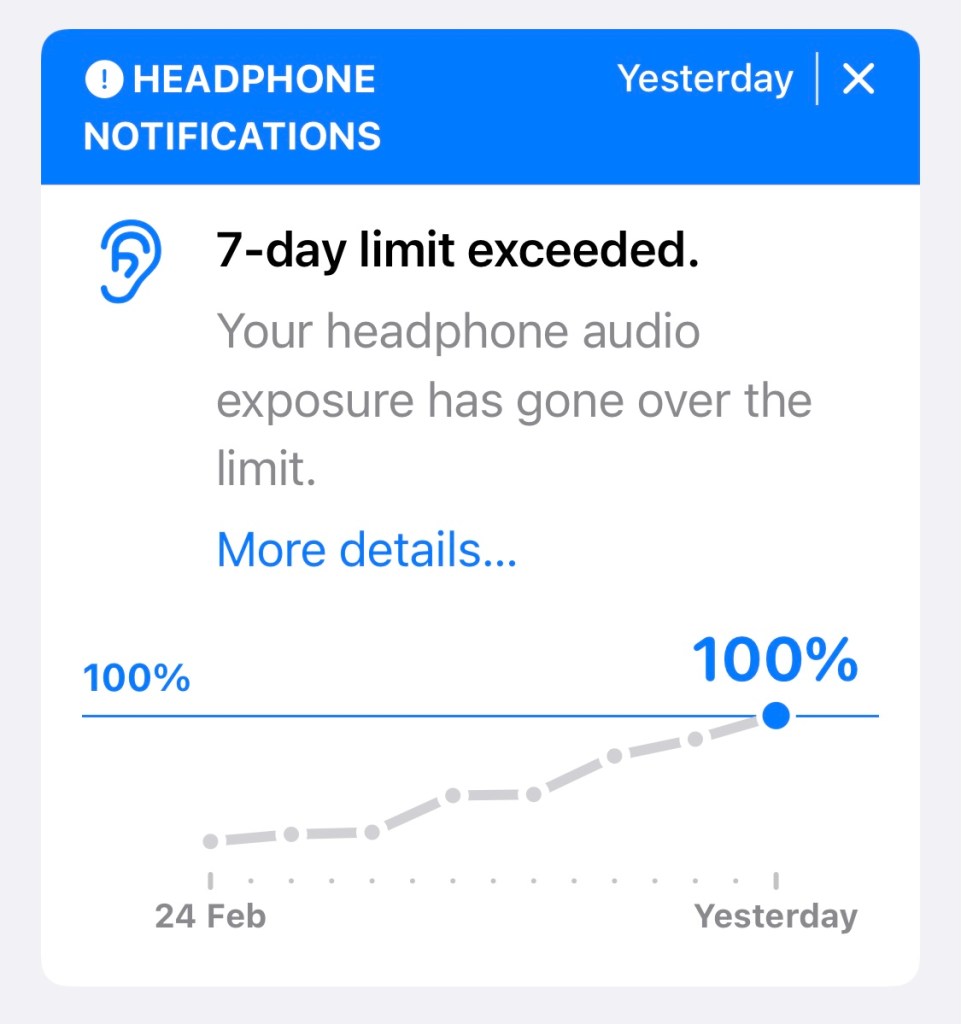 I must admit to playing music too loud most of the time, as the above capture from my Health app shows.