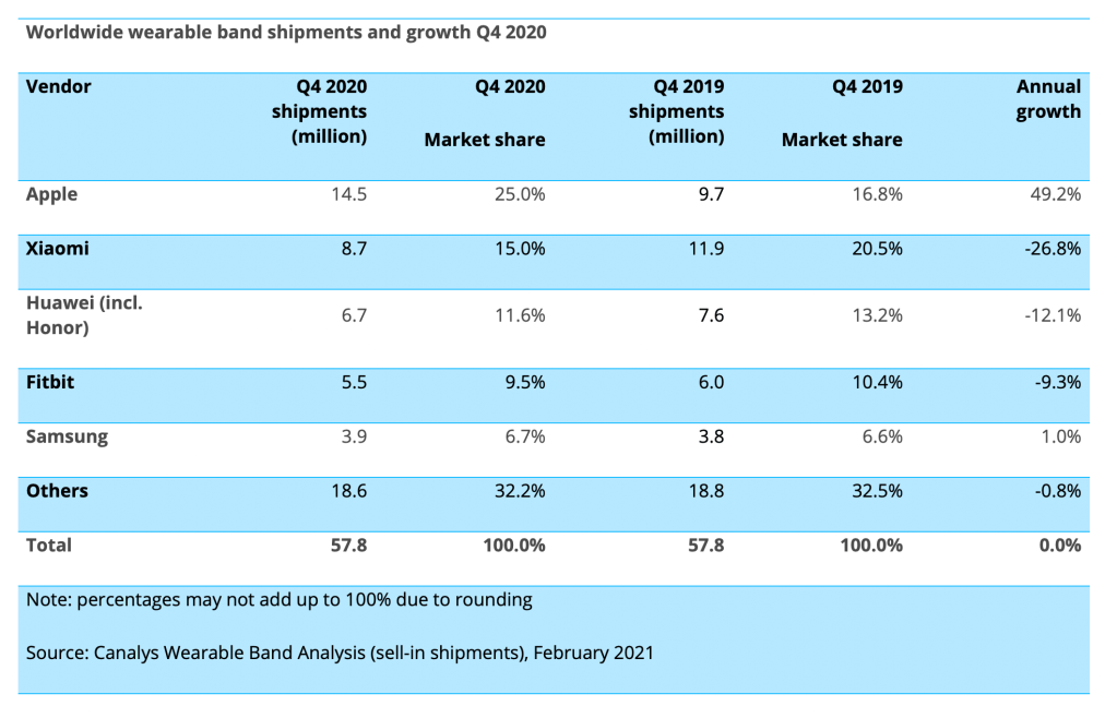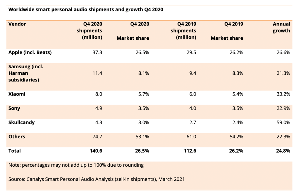 Worldwide smart personal audio and wearable shipments and growth Q4 2020 By Shaun on April 1, 2021 • ( 0 ) Apple is dominating personal audio in a big way. Look at the second column. Apple is dominating wearables… Second column. Share this: Click to share on X (Opens in new window) X Click to share on Facebook (Opens in new window) Facebook Like Loading...‹ The “endless diversity” of AmericaMcGST Podcast Episode 58 (You name it, we talked about it) ›Categories: Apple, Music
