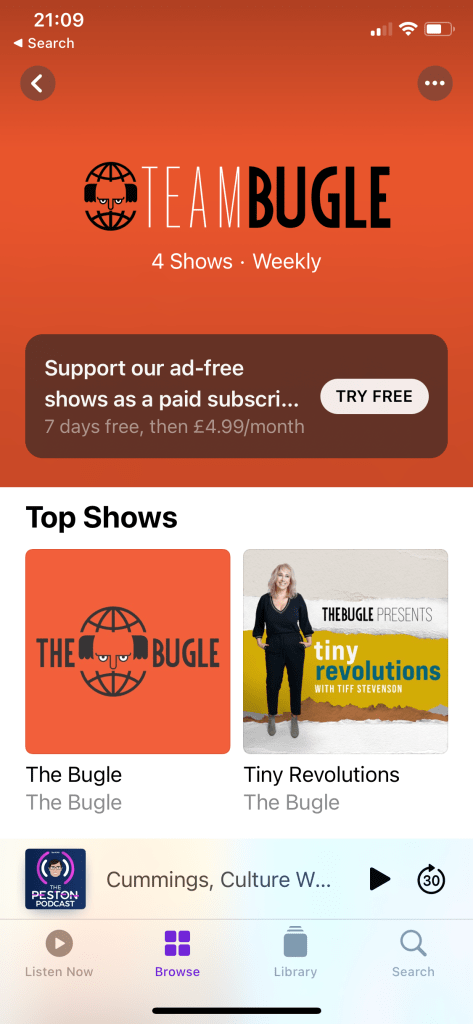 On Apple Podcasts you get to subscribe to publishers which can include a number of podcasts without adverts for a monthly charge. This is fine, but the randomness of the value on offer is concerning. I found one publisher that offer 4 podcast episodes a week for £4.99/month which seems high to me and other publisher’s content is all over the place in terms of volume and pricing. Potentially you could spend a lot of money if you like the content from a few publishers and you have to remember that you are merely removing adverts on the whole with some offering exclusive content to subscribers.