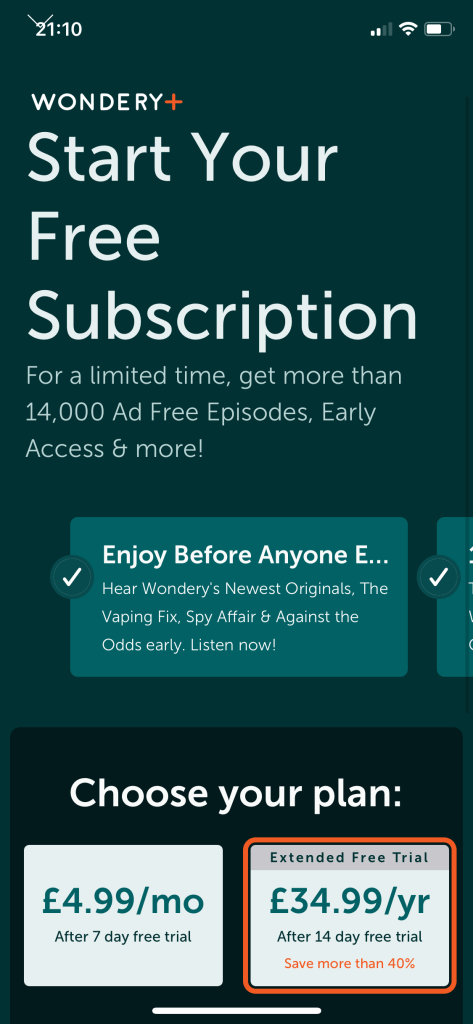 It gets more complex when I look at Wondery, who offers lots of fantastic content, because there is no subscription offering. You can, however, download the Wondery app and pay £34.99/year for 14,000 ad-free episodes, early access to some content and exclusive content that can be binged immediately. Wondery is an exception because the content is superb, but you can only listen in the app and so you would have to use at least two podcast apps to listen to paid and free content.