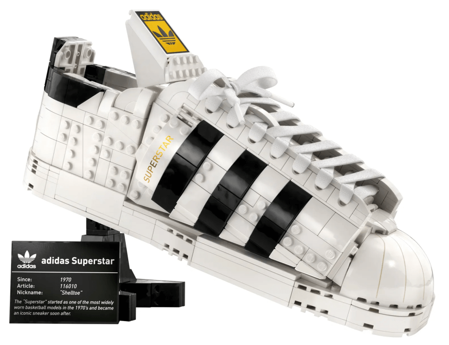 Just like the real thing, this LEGO version includes the iconic adidas Originals Superstar trainer graphics, shell toe shape, trefoil logo and serrated 3 stripes mark. Right shoe or left shoe? You decide! This set includes 17 extra LEGO elements so you can choose to build either the right-foot or left-foot trainer. For extra realism, it even has shoelaces and comes in an authentic shoebox.