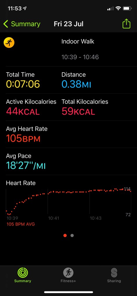 59kcal expended | 18’27” / Mile pace | Average heart rate 105BPM | Distance 0.38 Mile