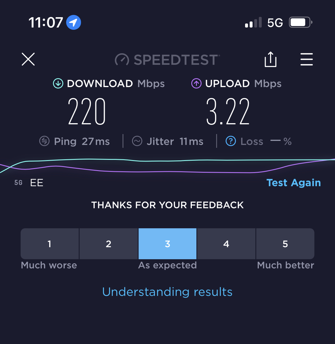 I was quite impressed with the top left number above yesterday as I waited in a queue to buy a coffee. The top right number, however, is concerning and maybe highlights some of the issues trying to use 5G brings with it.
