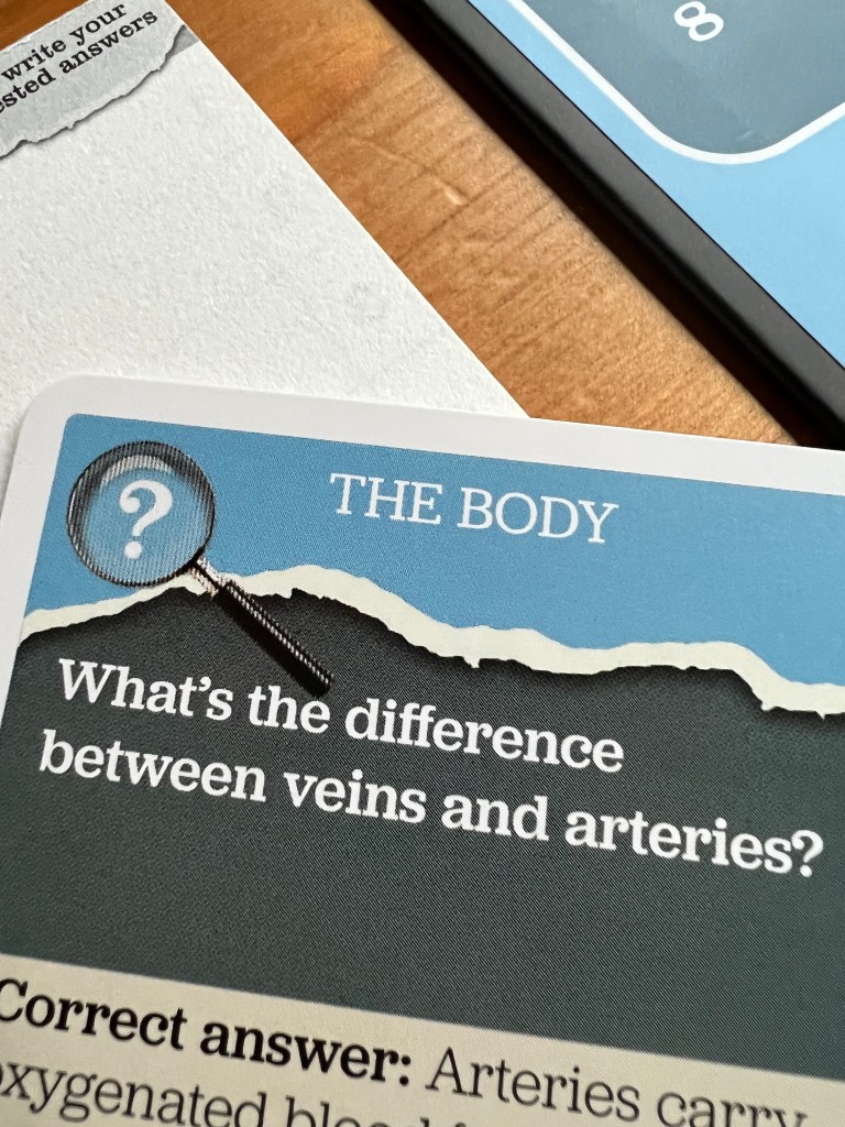 The main mechanism is to pick up a card with a question on it, always a question that you immediately want to know the answer to. Below that you will see a correct answer and a false answer, and the idea is that the other player(s) need to guess the factual answer.