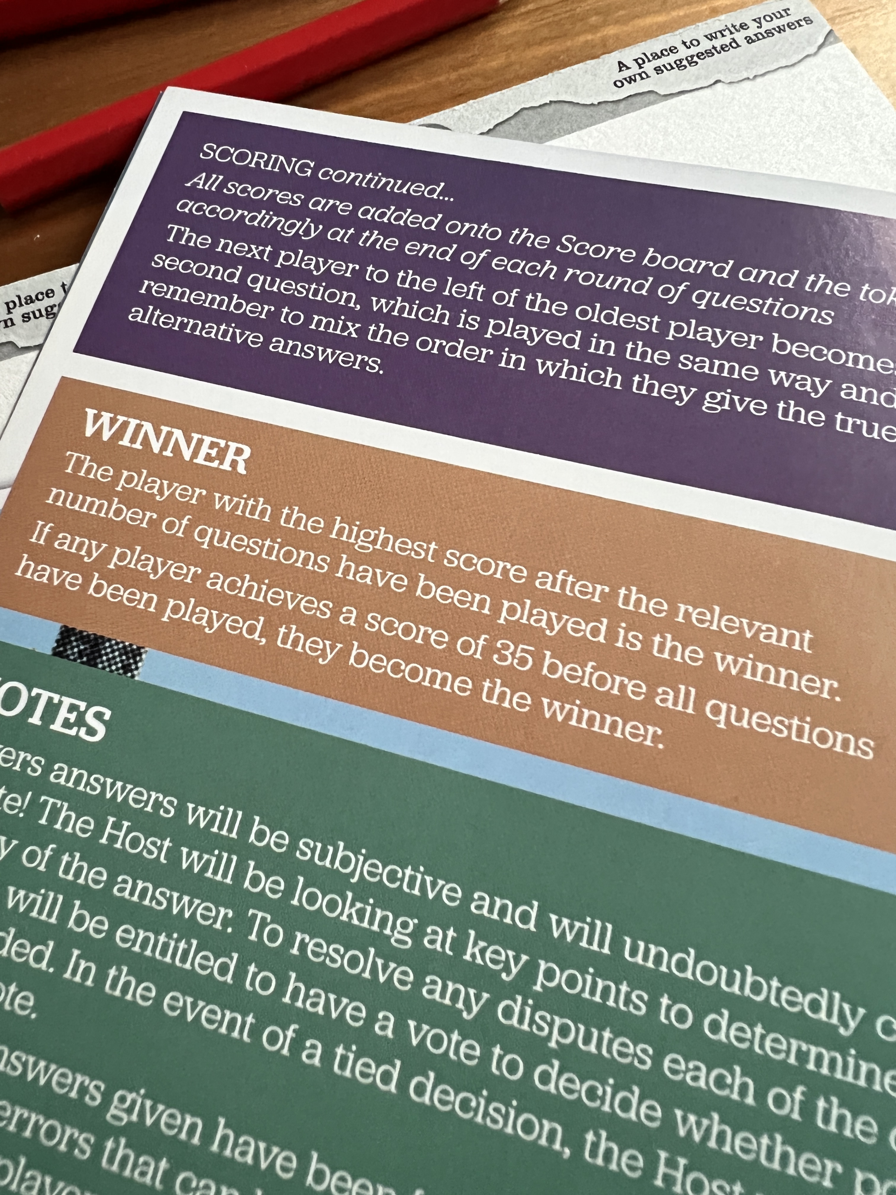 I really am struggling to find any fault here. The player tokens could be more substantial in my opinion because pop-out card doesn’t quite work, but they are consistent with the rest of the contents which, as I said before, have a traditional look and feel to them. Question cards, paper, pencils and a game board make for a carefully thought out game that just works, as Apple would say.