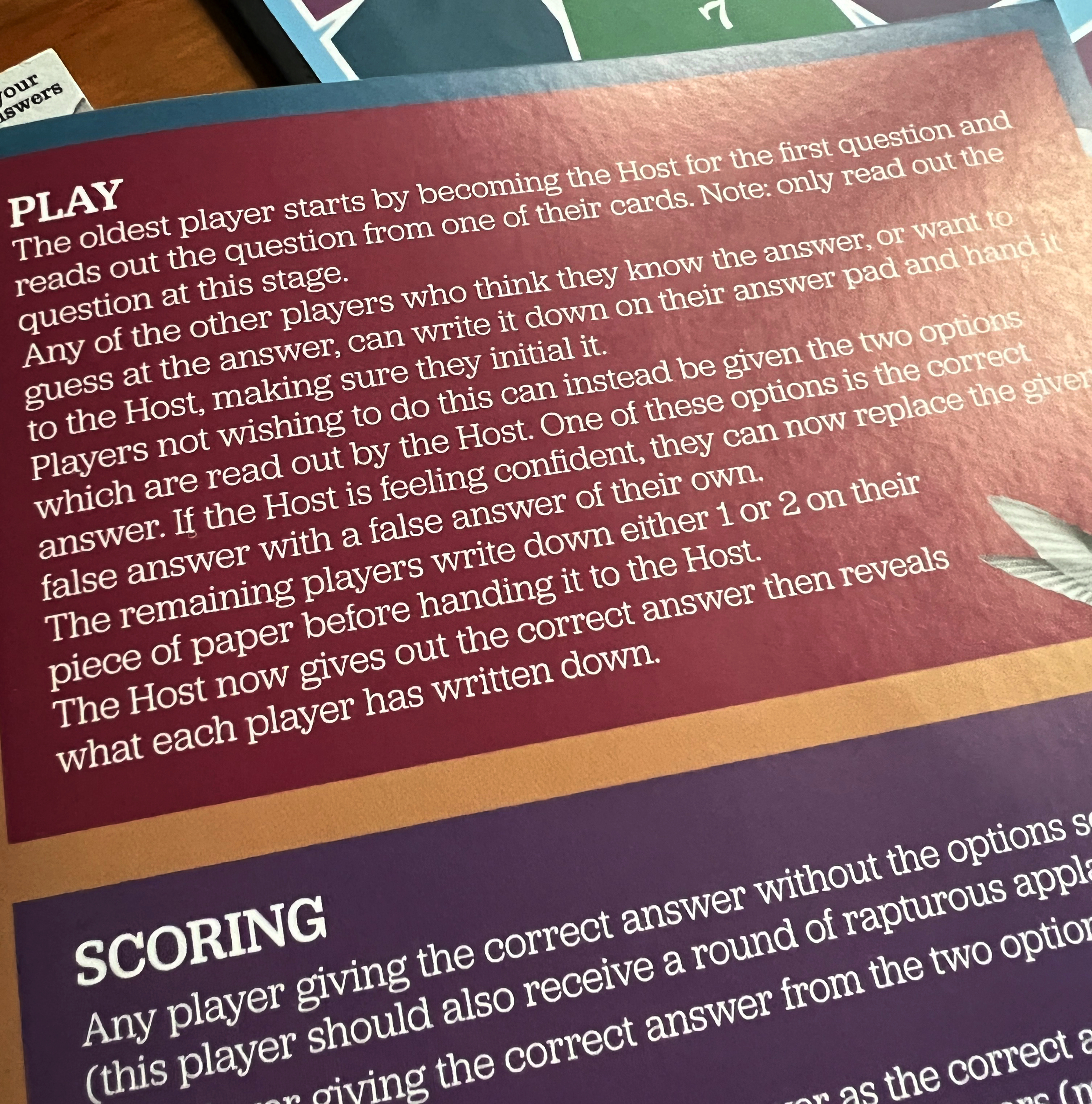 If you believe you know the answer to a question you can jump in and grab yourself 3 points. If you correctly guess from the two options provided you are given 1 point. And if the host’s made up answer is chosen he will get 2 points from each player, and the instructions gently suggest that they should be given a round of applause (listen to the Mystery Hour show to understand why that simple gesture is so important).