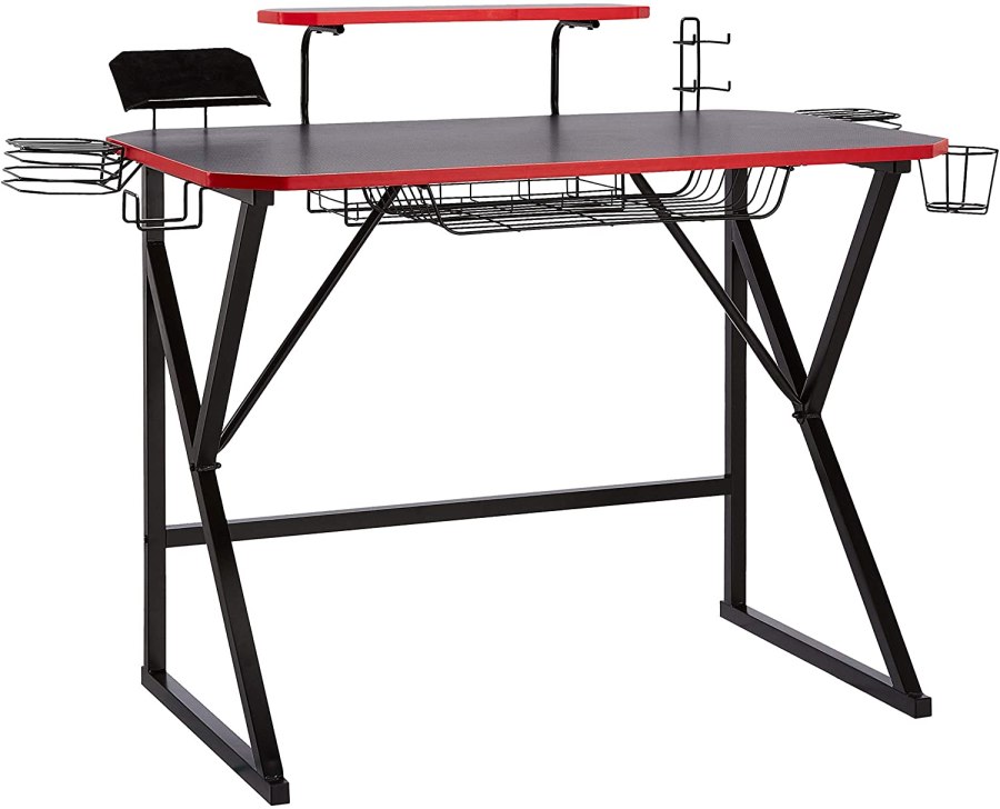 Amazon Basics Gaming Computer Desk with Storage for Controller, Headphone & Speaker – Red. More here.
