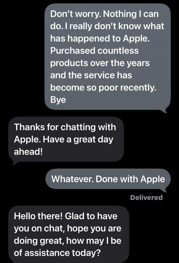 Do I expect too much from Apple? I don’t think so. The products are expensive and decent support is part of that price, but even if I happened upon one person who should not be in customer service, the AI implementation is woefully poor and completely impersonal. It’s also unreliable and puts more wasted time on the customer.
