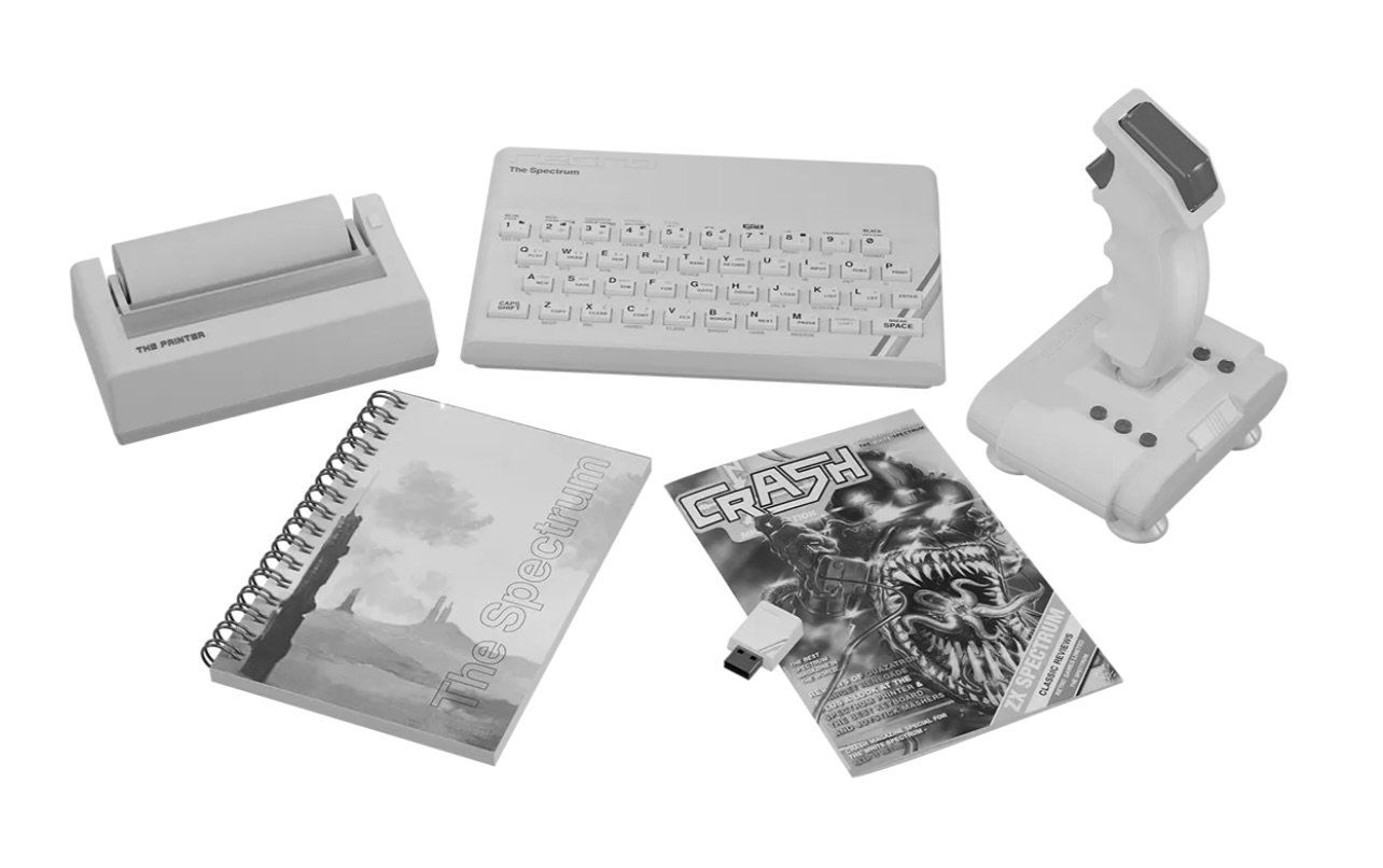 A sleek all-white tribute to the legendary one-millionth ZX Spectrum, released as a limited Collector’s Edition. Includes The Spectrum, THEQUICKSHOT II joystick, THEPRINTER, THEMICRODRIVE USB stick, a spiral-bound manual, and a companion CRASH magazine.