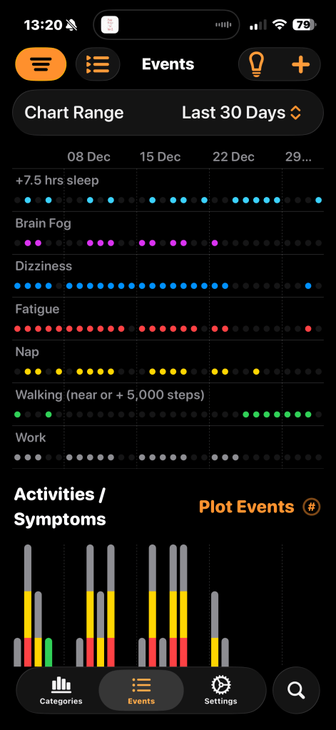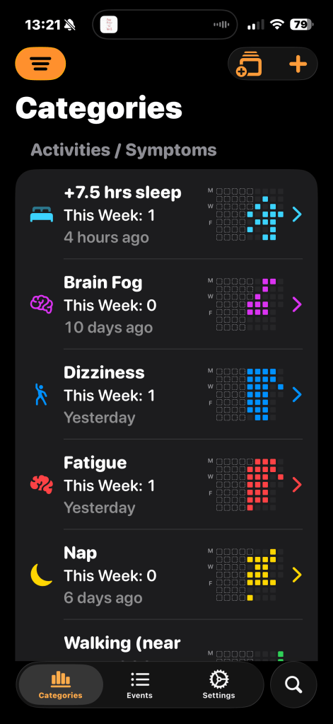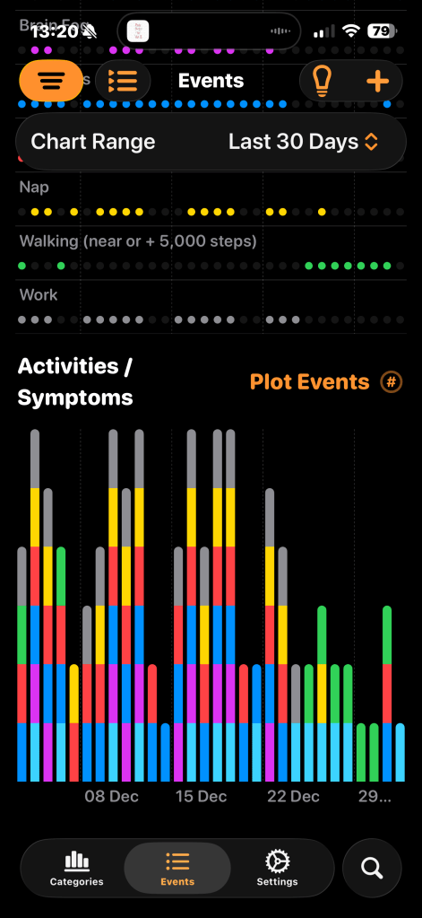 I’m already seeing from the above image that work is a big problem for me. I am working part time, but the lack of symptoms when there is no grey in the graph is apparent. I worked last Friday and had a major crash Saturday morning which is displaying after the screenshot was taken, but a pattern is already appearing. At no point would I have seen work as the main problem, but clarity has come from the colours and the columns.