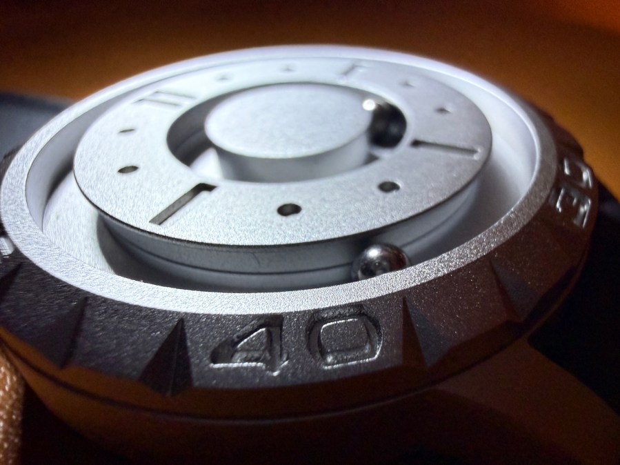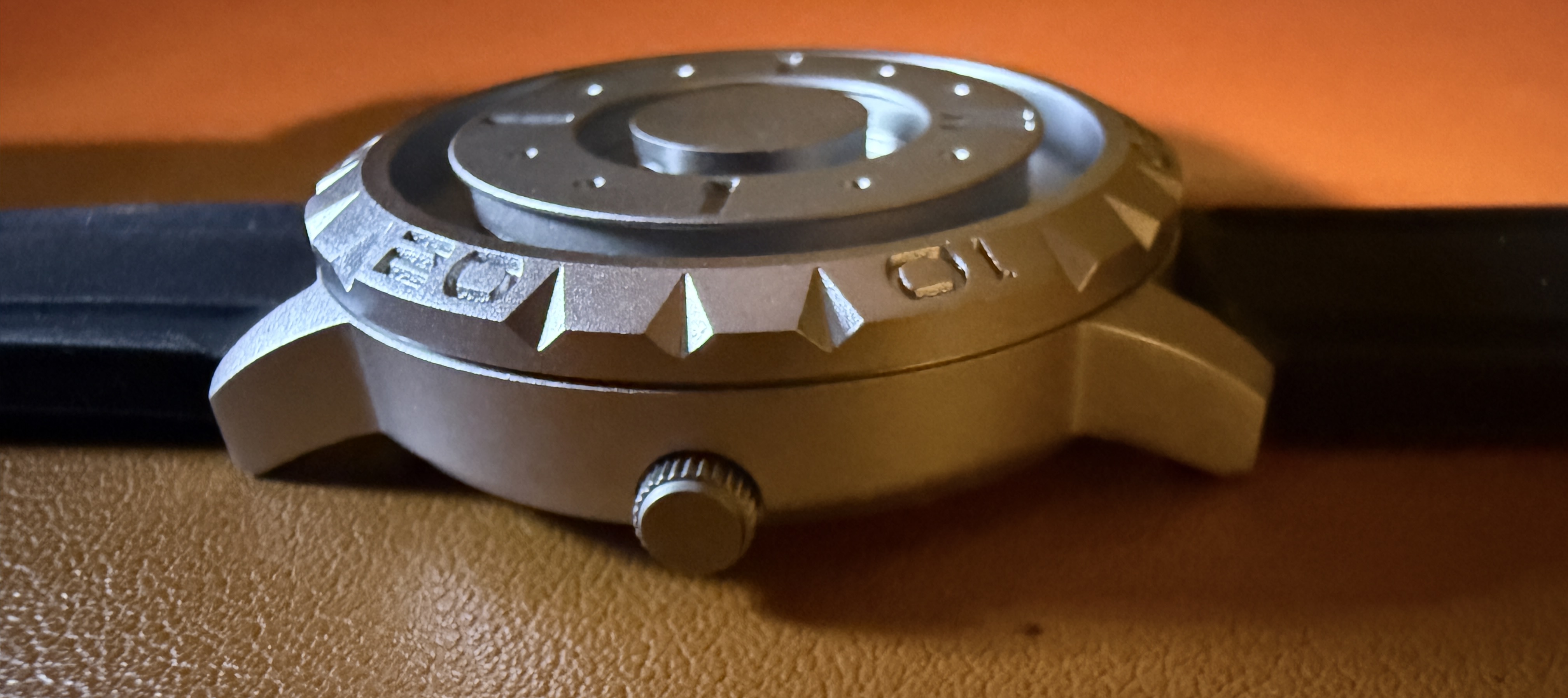 The main show is of course the unusual way this watch tells the time which is by using two magnetic beads. You spin the crown as normal and the two balls move around until the correct time is reached. It’s a strange feeling at first, but there is an even funnier trick. Shake the watch hard and the beads will love around and then magically go back to the correct time. Absolutely no practical purpose at all, but sometimes things just need to be different and fun.