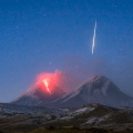 A photo, a meteor and an erupting volcano